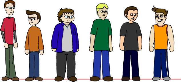I modified Justin's shoulder a little, rotated his arms inward, and I think it looks like a better neutral position. For Brad, I made his head bigger, changed his jaw, lengthened his shirt and arms, and I think he's closer to the proportions I'm after. (picture at the end)